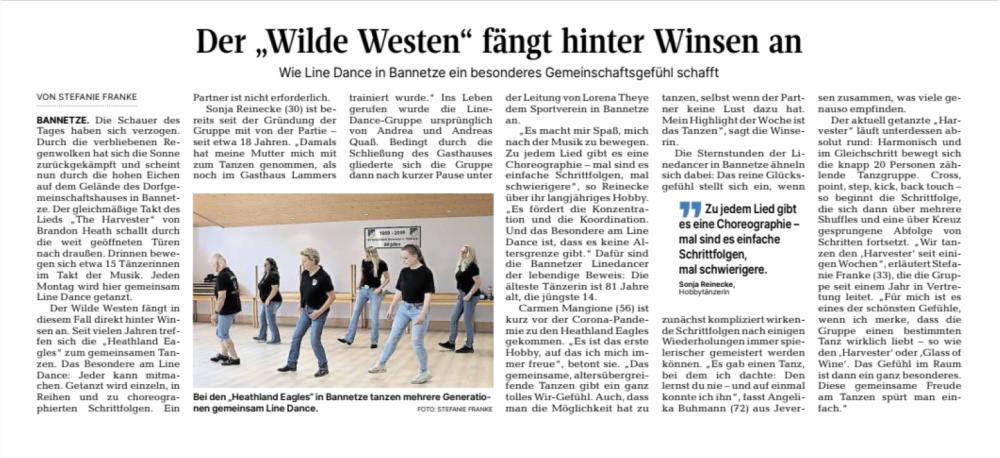 Line Dance ist ein Gruppentanz , der in Linienformation vor – und nebeneinander getanzt wird.Er entwickelte sich in den 50er Jahren in den USA und wurde mit den Jahren auch in Deutschlandimmer populärer. Seit 2002 ist Line Dance in Deutschland als Freizeitsport offiziell anerkannt.Beim Line Dance werden verschiedene Grundschritte zu festen Choreographien zusammengestellt.In der Regel werden diese Choreographien speziell auf einen Song abgestimmt.Aber solange der Rhythmus und Takt stimmt, können Tänze und Songs natürlich auch variiert werden.Auf diversen Line Dance- Portalen im Internet werden die Choreographien veröffentlicht.Auf Partys oder Veranstaltungen ist es so möglich, dass unterschiedliche Tänzer und Tänzerinnen zu einer einheitlichen Choreographie tanzen.Das Musikspektrum reicht von Country- über Pop und Disco- Musik bis hin zu vielen anderen tanzbaren Genres, so etwa Rock, Klassik und die zahlreichen Arten regionaler Musik, sodass im Endeffekt keine wirkliche musikalische Begrenzung mehr möglich istAber Line Dance ist jedoch noch viel mehr…Line Dance ist+ für „jedermann“ und „jedefrau“+ für jedes Alter+ sportlich+ GemeinschaftZusammengefasst: Line Dance macht einfach nur Spaß!Als jüngste Sparte im Sportverein Bannetze haben wir ca. 20 Mitglieder vom Schulkind- bis ins Rentenalter.Wir treffen uns jeden Montag um 18.00 Uhr im Sportheim in Bannetze (Bremer Str. 20)Wir freuen uns über jeden, der Line Dance einfach mal ausprobieren möchte.Kontakt: Stefanie Franke - Telefon: 0176 - 20 25 67 55